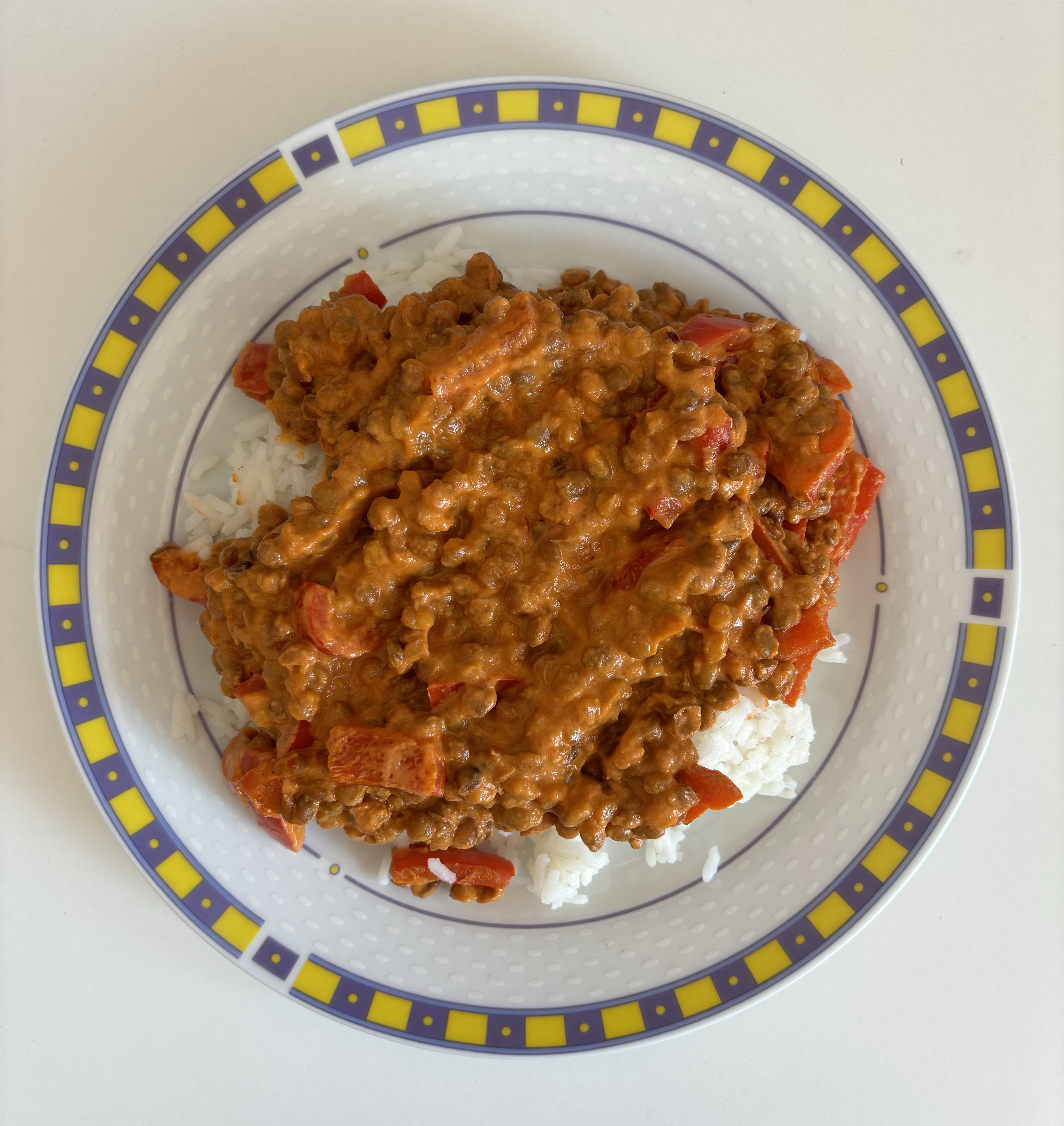 Zuerst das Gemüse schneiden, wenn es schnell gehen muss, kann man aber auch Tiefkühlgemüse verwenden. Das Gemüse anbraten und wenn es durch ist, die passierten Tomaten hinzufügen. Als nächstes kommt die Kokosmilch hinzu, hier, je nachdem, wie stark es nach Kokos schmecken soll, zuerst nicht die ganze Dose nehmen, sondern kurz probieren, wie der Geschmack ist und dann nach Bedarf den Rest hinzufügen. Zuletzt kommen noch die Linsen hinein und das ganze kann mit Salz, Pfeffer, Knoblauch, Curry und eventuell Chilipulver gewürzt werden. Servieren kann man das Gericht am besten mit Reis, Couscous, Quinoa, oder anderen Beilagen.