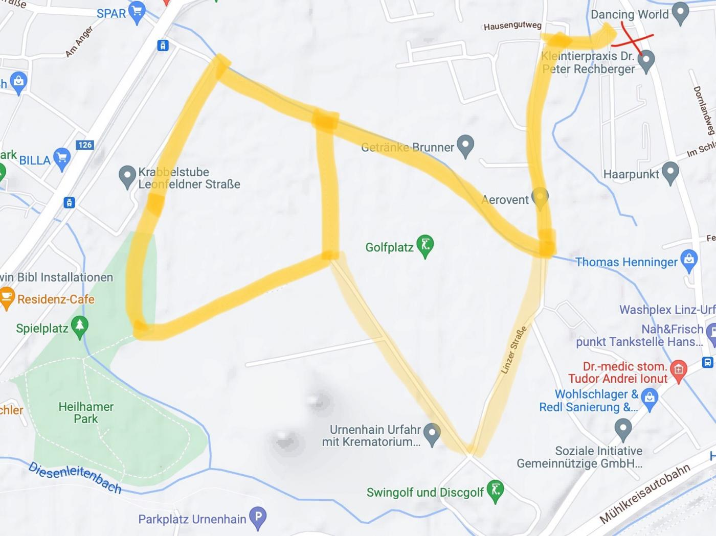 A slightly shorter route starts directly behind the Pulvermühlstraße dormitory and leads to the small bridge at the back of the Pulvermühlpark. When you go along the left side of the Linzer Straße, you will cross another bridge. Afterwards you will see a large field on your right and a narrow footpath on your left that goes along a small stream. This path is particularly beautiful in autumn as you will be surrounded by colorful leaves. Behind the trees on the left is a large golf court, just in case you would like to try disc golf once.