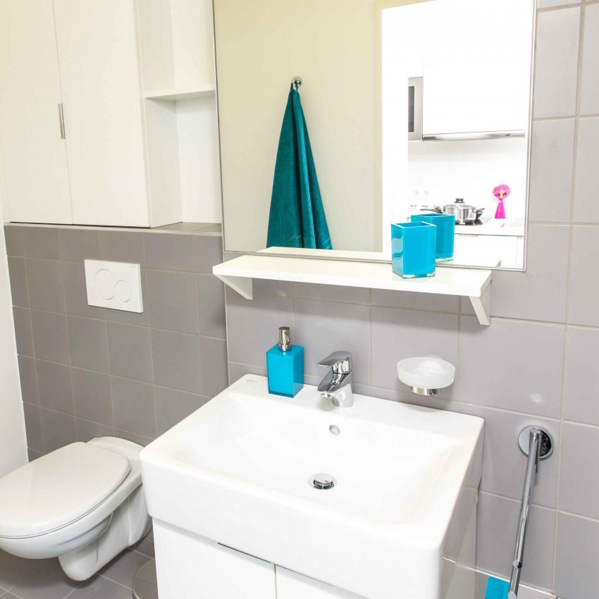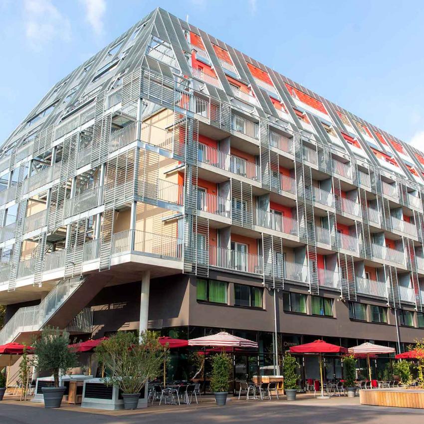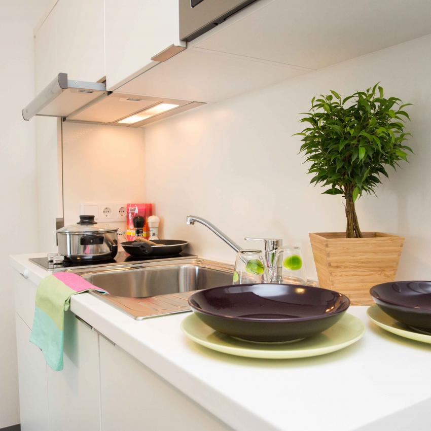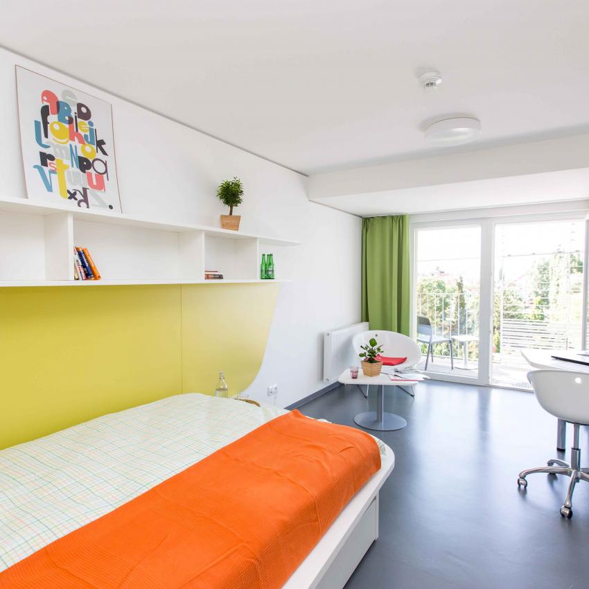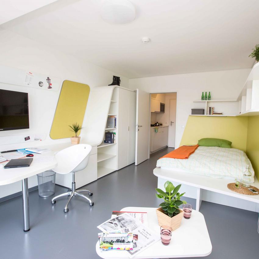 Die 149 top ausgestatteten Studios sind entweder alleine oder zu zweit bewohnbar, mit Kitchenette, Dusche/WC, extra großem Bett und viel Stauraum. Viele Einheiten haben sogar eine Loggia oder einen Balkon. Auch barrierefreie Studios sind verfügbar. Hier geht's zum virtuellen Rundgang.