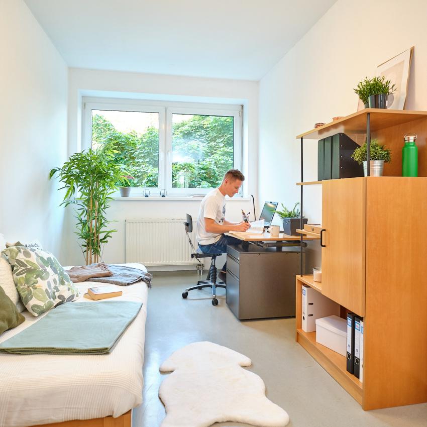Auch im Haus selbst wird’s dir nicht langweilig: Nach einem langen Unitag kannst du dich im hauseigenen Fitnessraum austoben, im Gemeinschaftsraum abhängen, im Musikzimmer musizieren oder dich im Studierraum aufs nächste Prüfungspensum vorbereiten.