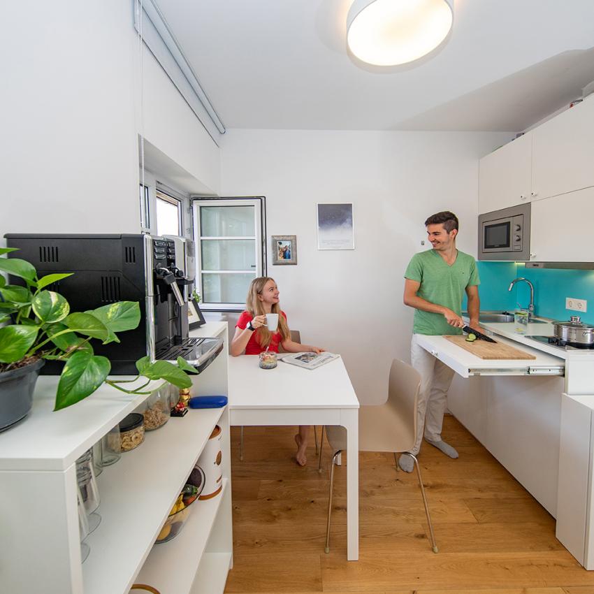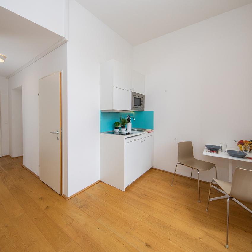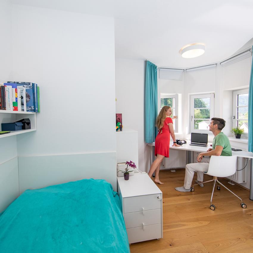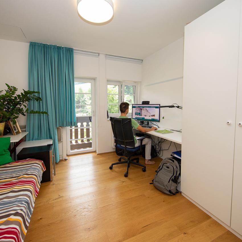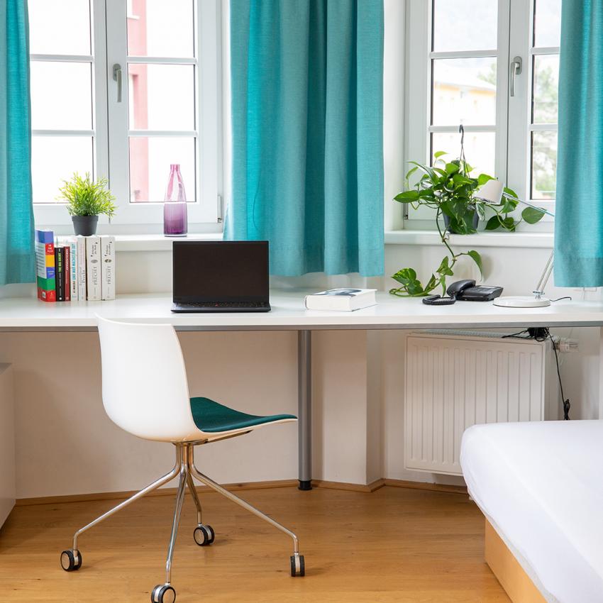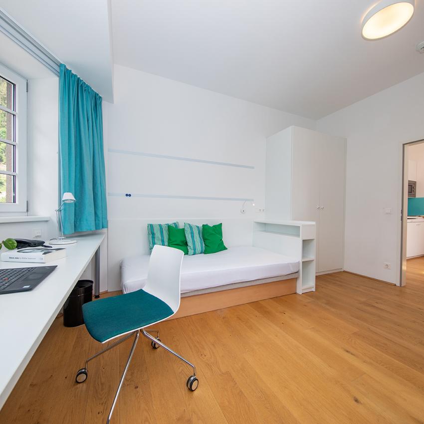 Die Einzelzimmer sind voll möbliert und etwa 10 bis 14 m² groß (ohne Bad, Küche und Vorraum). Der türkisfarbige Touch in den Zimmern sorgt für gemütliches Wohnen und ruhiges Studieren.