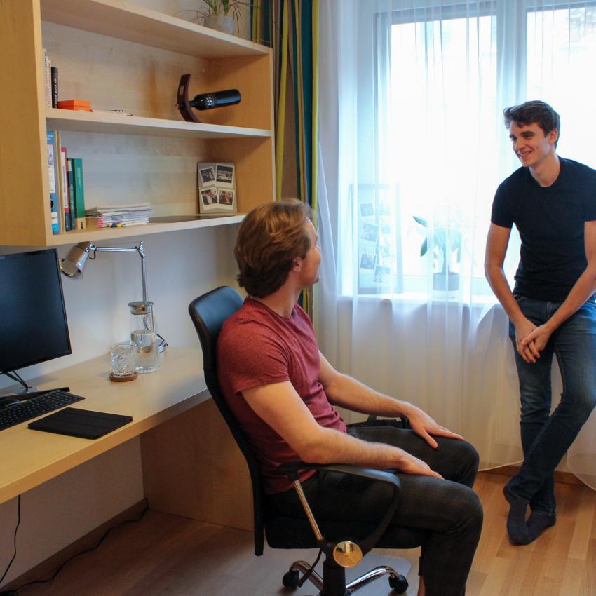 You want to exercise, celebrate a passed exam, or practise the guitar? There's no need to leave the dorm, because you will find gym, party room and music room in the basement. The big common room is ideal to study with friends, meet for coffee or a chat. The big, well equipped common kitchen can be used to cook and eat together.