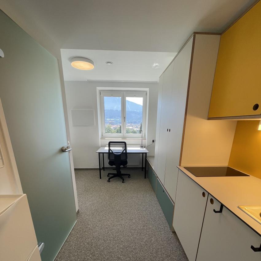 The 'transverse building' at Frau-Hitt-Straße 14 has been extensively renovated over the last twelve months. From mid-September 2024, 15 fully furnished single rooms will be available on the top floors. These units are equipped with a kitchenette and a private bathroom (shower, WC). The view from the room units is outstanding - the city of Innsbruck, the Nordkette mountain range and the Bergisel ski jump feel “close enough to touch”.