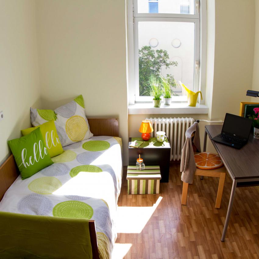 Various room categories are available at the Pyrkergasse residence. There are a total of 6 single rooms and two large twin rooms, which are equipped with a private shower and WC. 24 single rooms with washing facilities and 2 single rooms without washing facilities have no private bathroom, but have access to communal shower and WC facilities. These are located on every floor, along with a common kitchen and a large dining room.